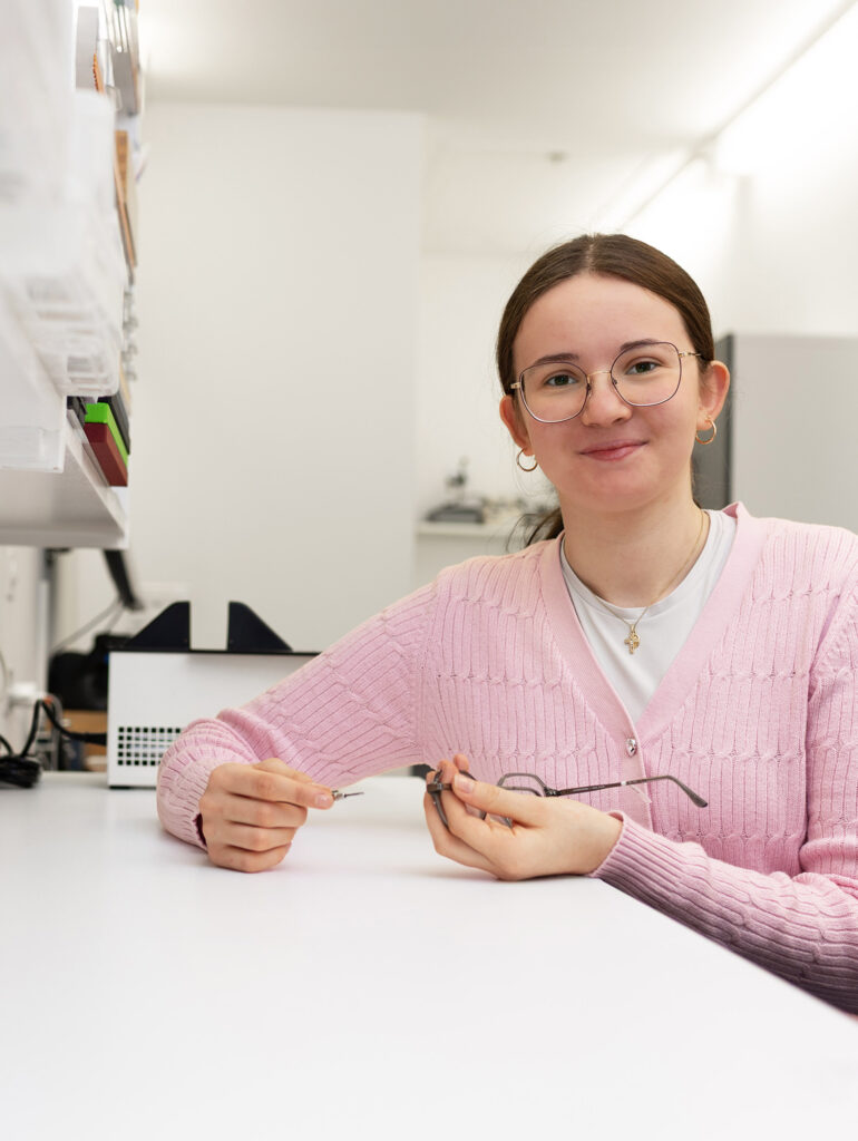 Sandra hat ein Gespür für Mode und Ästhetik. Die leidenschaftliche Augenoptikerin mit Faible für Tai Chi zeigt Ihnen Ihre neue Lieblingsbrille. Und setzt diese kurz darauf mit viel Sorgfalt in der Werkstatt zusammen. Unsere helfende Hand mit viel Fingerspitzengefühl.